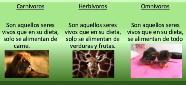 La alimentación de los animales es muy diversa. Los hay que sólo comen vegetales: son herbívoros. Otros se alimentan exclusivamente de animales: son carnívoros. Y los que tanto pueden comer vegetales como animales se llaman omnívoros.